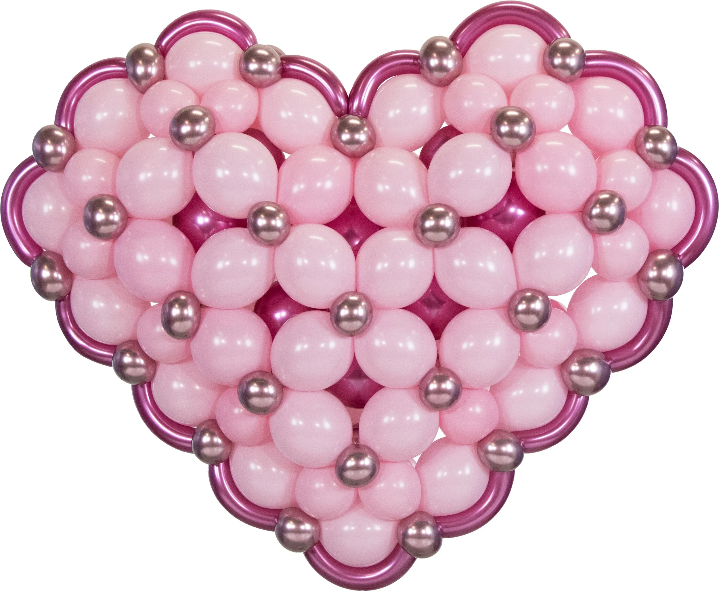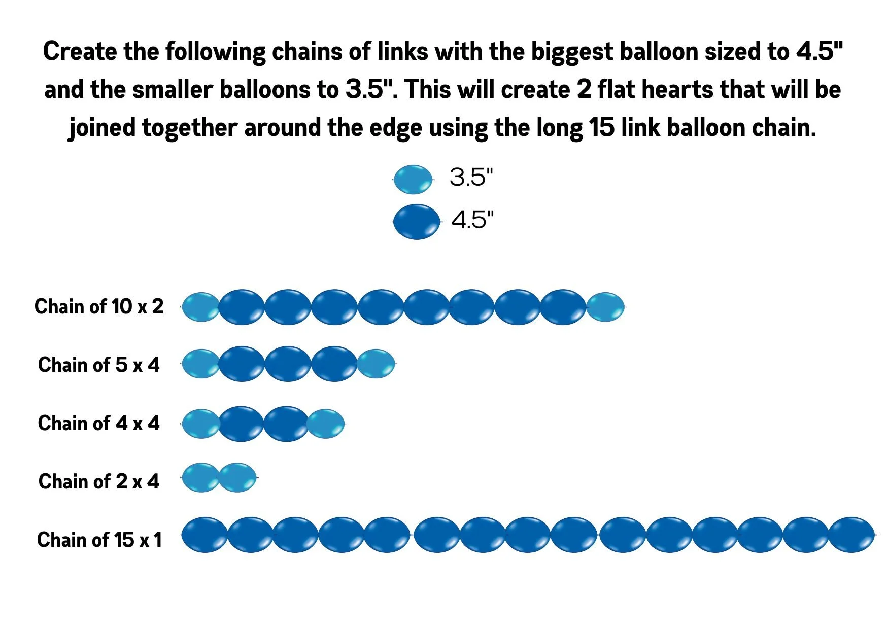 1. Create the following chains of link balloons with the biggest balloons sized to 4.5” and the smaller balloons to 3.5“. This will create 2 flat heart shapes that will be combined using the large chain.