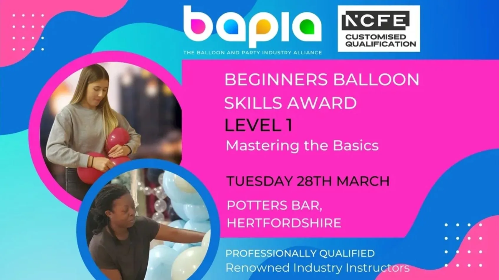 As this BAPIA Level 1 - Beginners Balloon Skills Award is accredited by NCFE under their Customised Qualifications all learners successfully completing the programme will receive a certificate of achievement that will be issued by NCFE. Delegates choosing this course can be confident that the level of training they receive will be of the highest standard. As an NCFE Customised Qualification this means the programme has been externally assessed and been recognised for the quality and rigour of the qualification.